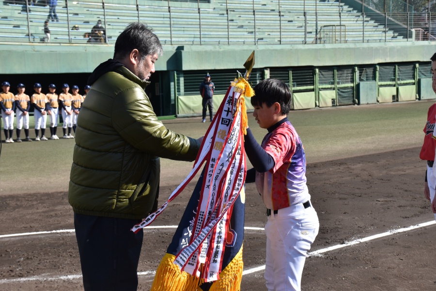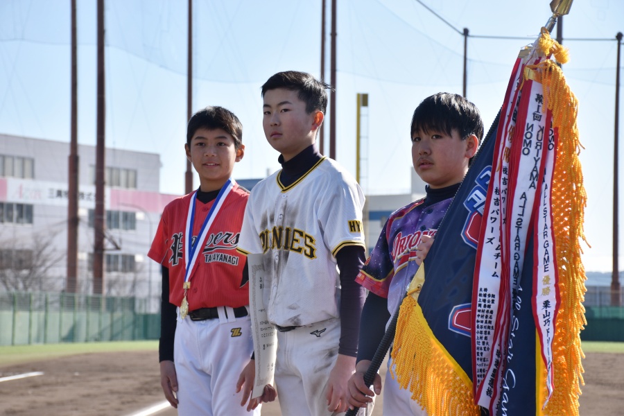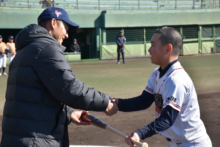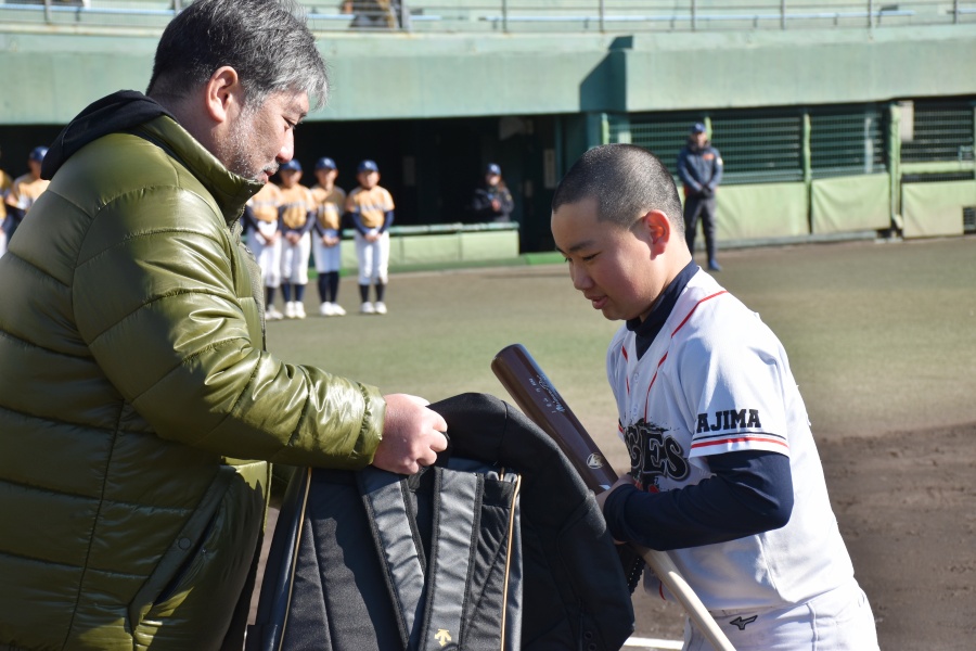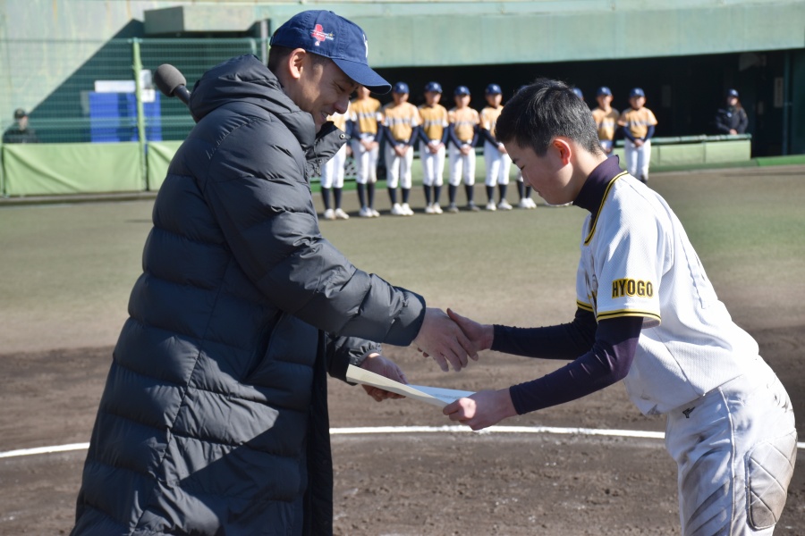 栄えある大会MVPは劇的勝ち越し本塁打を放った但馬選抜の小谷選手が選ばれ、野茂英雄大会委員長からオリジナルグローブ、栗山巧大会委員長から公式モデルバット、(株)ナイキジャパン 様、デサントジャパン(株) 様からそれぞれ賞品が贈られました。