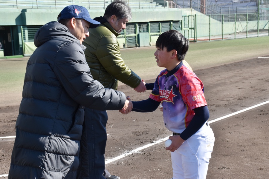 また敢闘賞には、但馬選抜から上垣 選手、栗山チームから近江選手が選ばれ、両大会委員長よりサインボールが贈られました。
